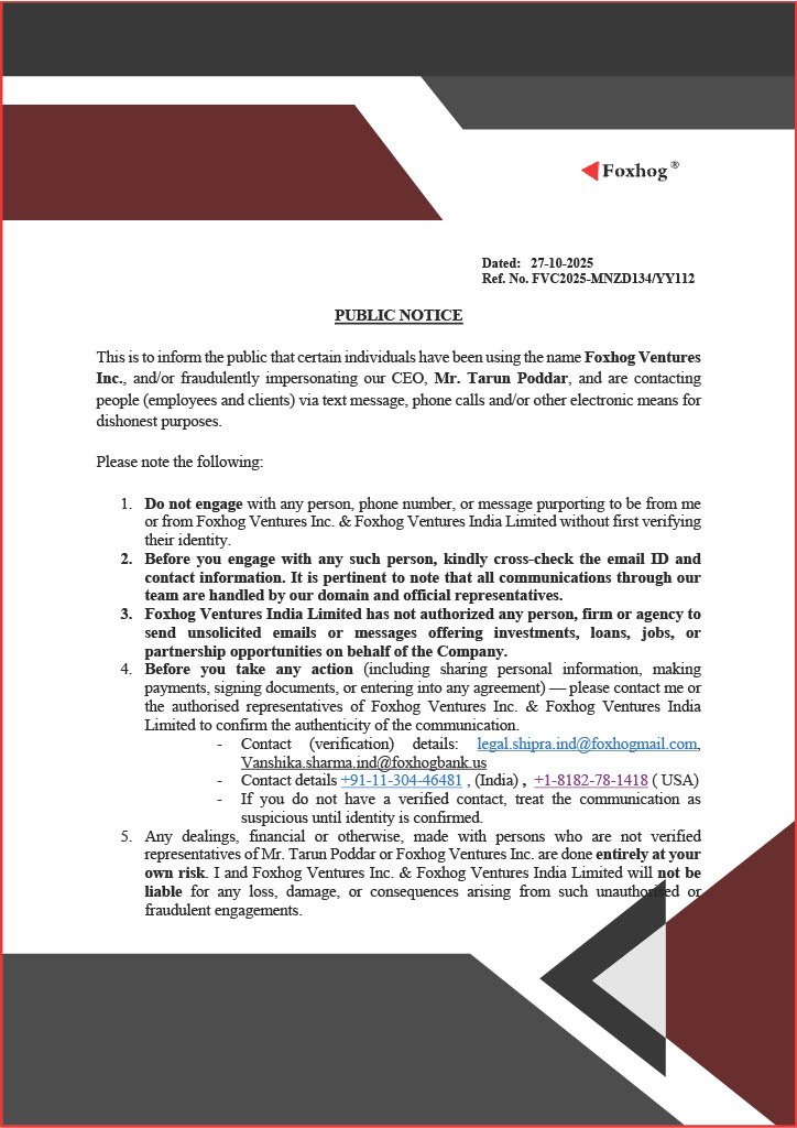 Foxhog Ventures Inc. and its Indian subsidiary Foxhog Ventures India Limited have issued a public warning regarding fraudulent activities involving individuals impersonating Mr. Tarun Poddar, the company’s Chief Executive Officer, and misusing the Foxhog Ventures name for deceptive purposes.