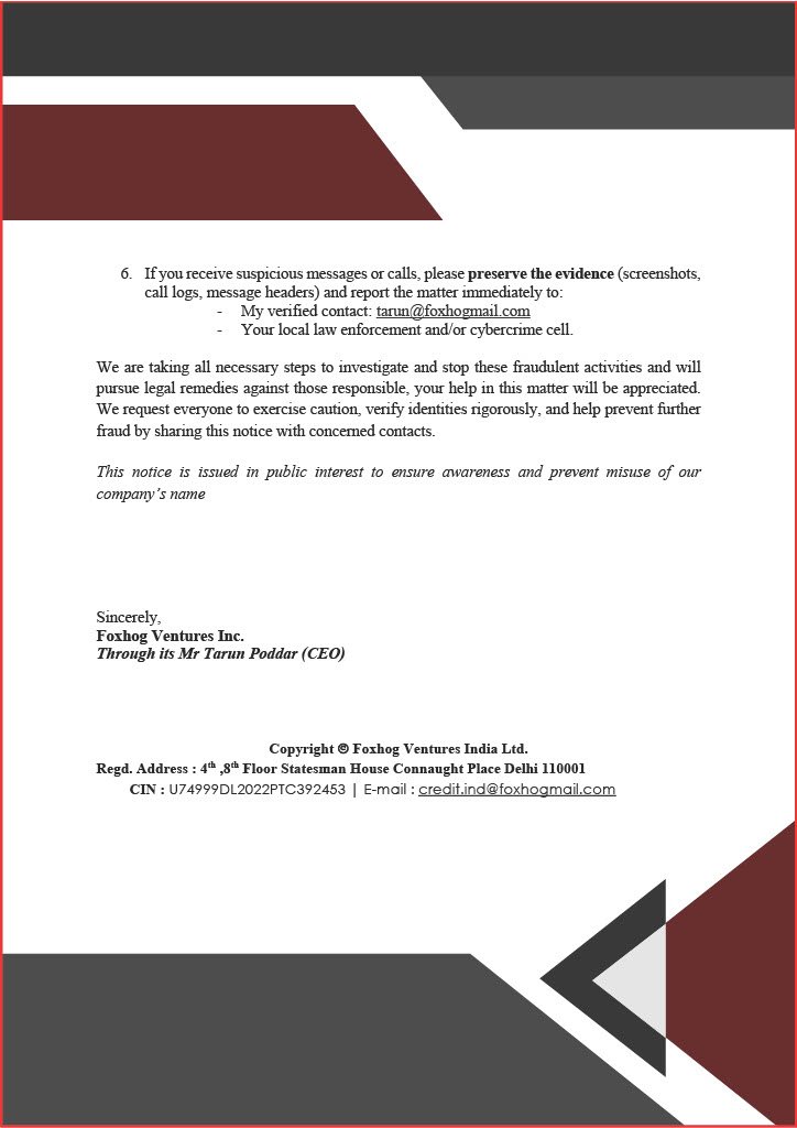 1. Verify authenticity — Always confirm the identity of anyone claiming association with Foxhog Ventures Inc. or Foxhog Ventures India Limited.